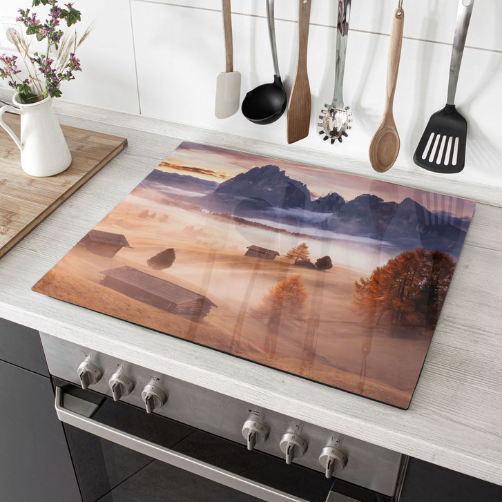 Diese hochwertige Herdabdeckung bringt die malerische Schönheit eines Herbstmorgens in den Alpen direkt in deine Küche. Weiche Nebelschwaden hüllen die goldenen Wiesen ein, während die ersten Sonnenstrahlen die rustikalen Berghütten und leuchtenden Bäume in warmes Licht tauchen. Die imposanten Berggipfel im Hintergrund runden das Panorama ab und verleihen dem Motiv eine majestätische Tiefe.