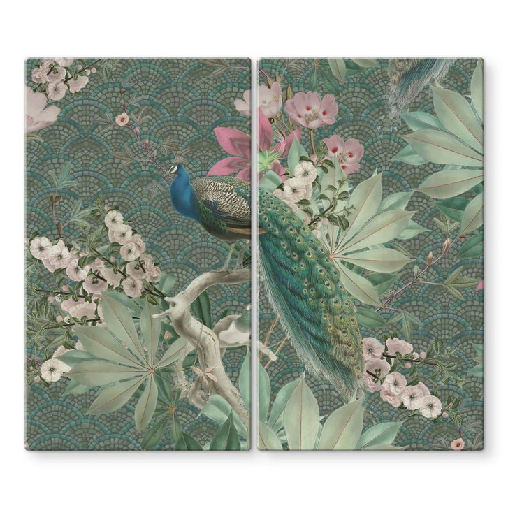 Herdabdeckplatte Pfau im Tropengarten auf Mosaik - Bloomery Decor