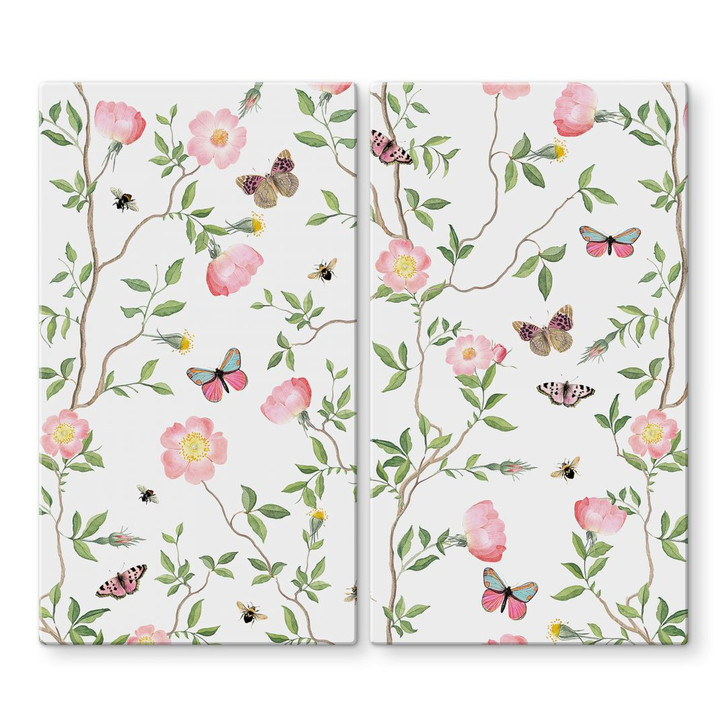 Für viele Menschen ist die Küche das Zentrum ihres Zuhauses. Damit sich die ganze Familie wohlfühlt, darf es an raffinierten Accessoires nicht fehlen. Mit diesem Blumenmotiv lässt sich eine zeitlos schöne Küche gestalten, die immer wieder zum Wohlfühlen einlädt. Die florale Illustration von UN Designs zeigt rosa Christrosen, die an einem Busch wachsen. Bunte Schmetterlinge umschwirren die zarten Blüten und kündigen den Frühling an. Die Glasplatte kann als Spritzschutz, Kochfeldabdeckung, Schneidebrett oder dekorative Servierplatte verwendet werden. Ein multifunktionales Accessoire, das in keiner Küche fehlen sollte.