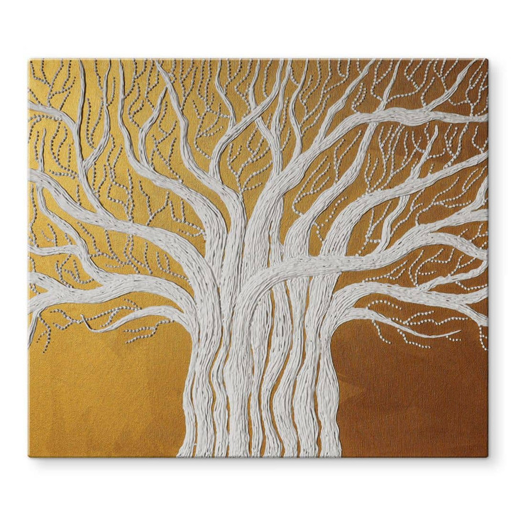 Verleihe deiner Küche mit dieser hochwertigen Kochfeldabdeckplatte einen Hauch von Eleganz und Symbolik. Das kunstvolle Motiv des weissen Lebensbaums steht für Wachstum, Stärke und Verbundenheit und hebt sich eindrucksvoll vom schimmernden Goldhintergrund ab. Die filigran ausgearbeiteten Details der Äste erzeugen eine besondere Tiefe und verleihen dem Design eine harmonische Optik.