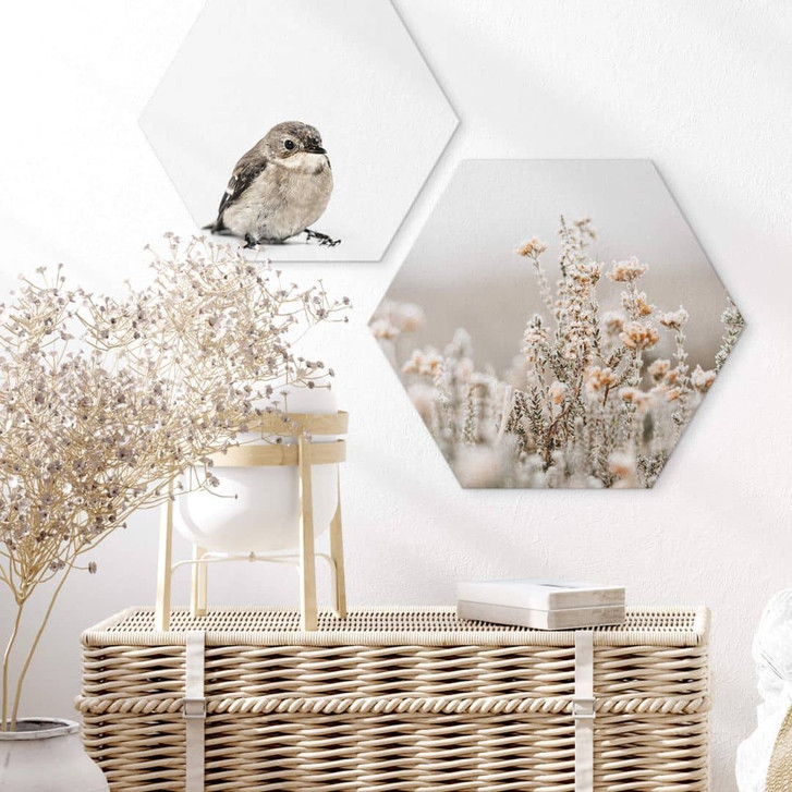 Gestalte mit unserer sechseckigen Wandkunst eine einzigartige Galerie an deiner Wand. Unsere waben- und sechseckige Wandkunst kann zu einem trendigen Hingucker in deinem Zuhause werden. Die einzelnen Dekoelemente lassen sich nicht nur nach Belieben anordnen, sondern auch jederzeit ergänzen. Zur Auswahl stehen nicht nur verschiedene Motive, sondern auch unterschiedliche Materialien. Ob Holz, Alu-Dibond mit Metallic-Effekten oder Wandtattoos – die Gestaltungsmöglichkeiten sind grenzenlos.
