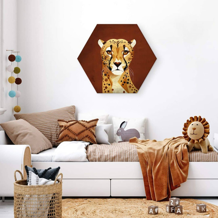 Die Gestaltung des Kinderzimmers ist wichtig für die Entwicklung der Kinder. Hier wird den ganzen Tag gespielt, getobt und gelernt. Mit diesem Wandbild im Hexagon-Format werden Kinder gerne Zeit in ihrem Zimmer verbringen. Das Wandbild mit der Illustration von Dieter Braun ist ein absoluter Hingucker an der Wand im Kinderzimmer. Es zeigt das Porträt eines Geparden. Die Raubkatze blickt interessiert in die Kamera.