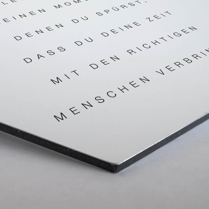 Mit einer Materialstärke von 3 mm hat das schlanke Design einen eleganten Galeriecharakter. Die Aluminiumplatten bestehen aus zwei 0.3 mm starken Aluminiumschichten und einem gehärteten Kunststoffkern, der den Platten eine hohe Stabilität, Langlebigkeit und Formstabilität verleiht.