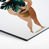 Eine nackte, kurvenreiche Frau mit langen schwarzen Haaren hält eine Monstera-Pflanze und verbirgt so ihre weiblichen Reize. Hol dir dieses beeindruckende Bild nach Hause und dekoriere mit zeitgenössischer Kunst von Kubisitka by Boris Draschoff!