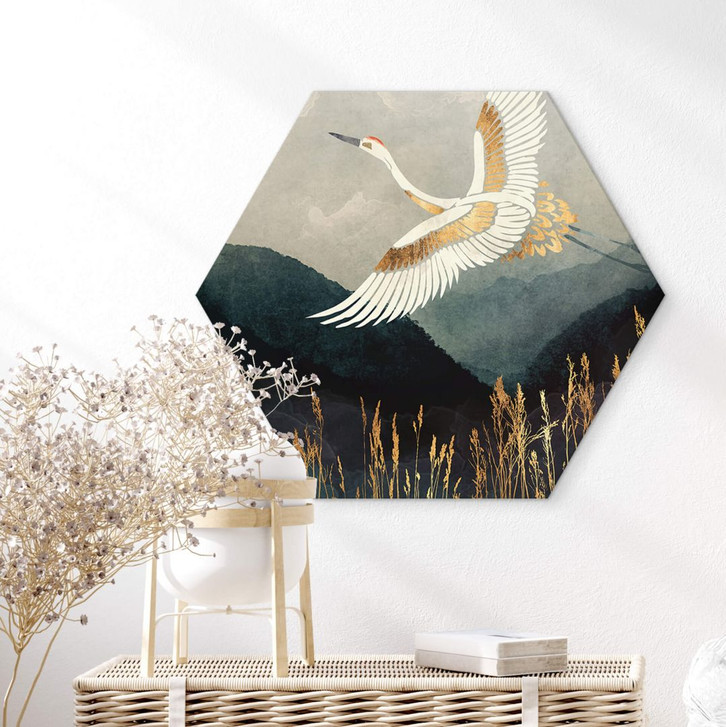 Nimmst du dir einfach mal eine kleine Auszeit und entfliehst dem Stress? Nirgendwo gelingt das besser als in den eigenen vier Wänden. Der Grafik-Kunstdruck von SpaceFrog Designs zeigt einen Kranich in Weiss und Gold, der mit ausgebreiteten Flügeln über eine Graslandschaft fliegt. Im Hintergrund sind dunkle Berge zu sehen. Dieses sechseckige Wandbild bringt einen Farbtupfer, der deinem Zuhause einen ganz neuen Look verleiht.