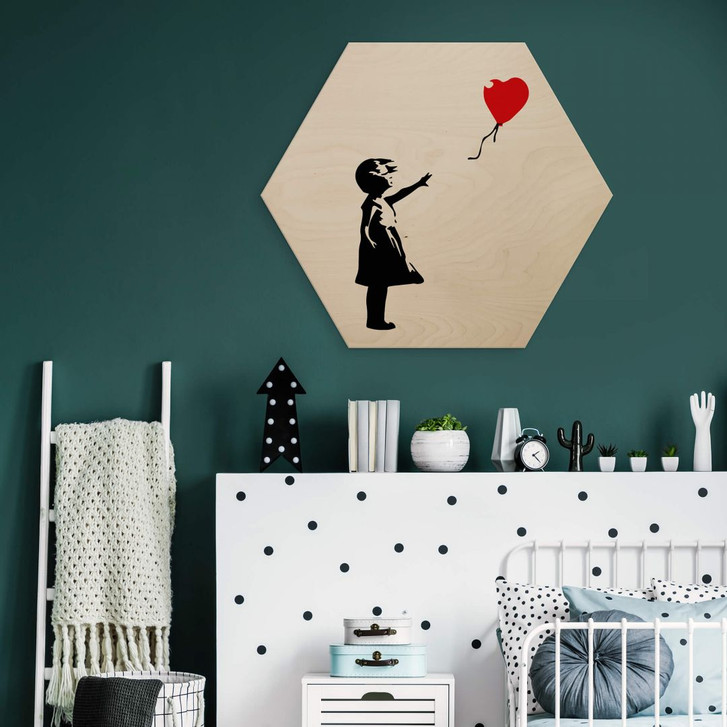 Wenn alles schwarz-weiss erscheint, kommt ein roter Ballon daher, um Hoffnung zu symbolisieren. Das wohl bekannteste Werk von Banksy ist eines der wenigen Motive, das keine politische Botschaft enthält. Das legendäre Gemälde kommt als hochwertiges Holz-Hexagon-Bild zu dir nach Hause.