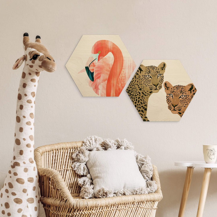 Die Hexagone überzeugen nicht nur durch ihre Nachhaltigkeit und Umweltverträglichkeit, sondern auch durch ihre natürliche und einzigartige Optik. Jedes Sechseck erhält durch die Holzmaserung und die kreuzweise verleimten Holzschichten eine individuelle und robuste Optik. Das Motiv wird direkt auf eine stabile Birkensperrholzplatte gedruckt, sodass die Struktur des Holzes durch das Motiv schimmert.