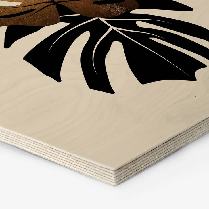 Hexagon - Holz Kubistika - Schwarz-goldene Monstera Blätter