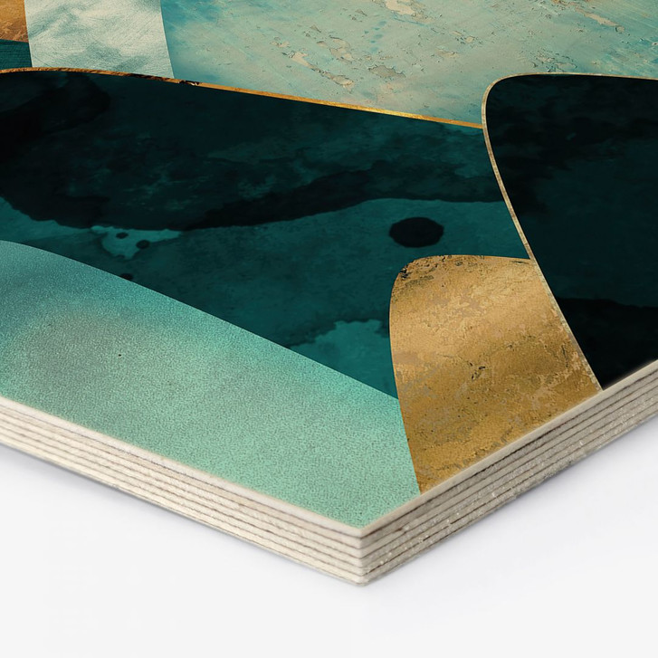 Hexagon-Holzbild Abstrakte Berge in Gold und Blau - SpaceFrog Designs