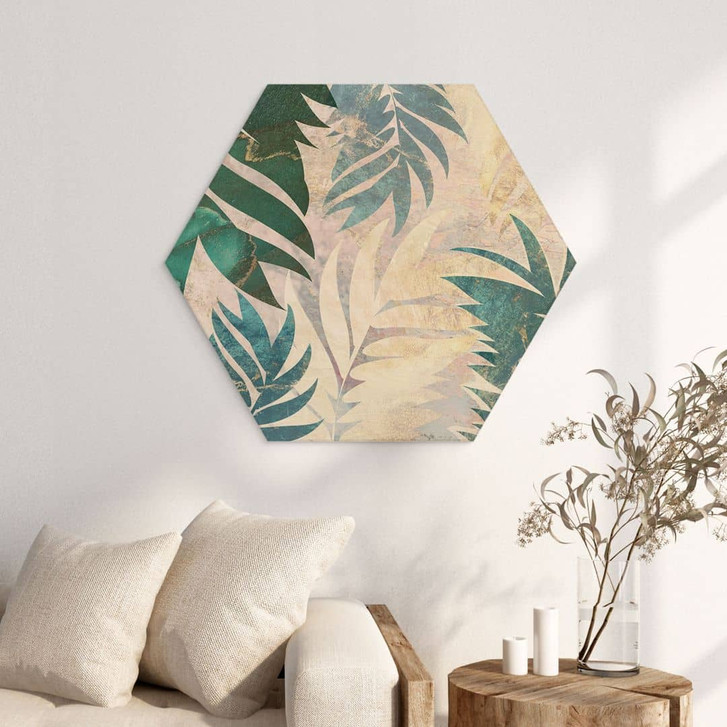 Hexagon Holzbild Exotische Palmenblätter in Gold-grün - Manovski