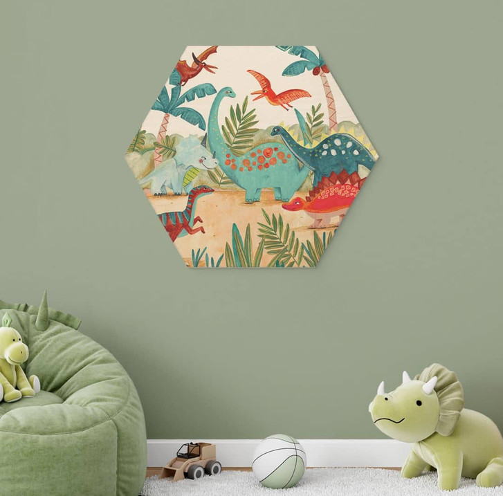 Hexagon Holzbild Farbenfrohe Dinosaurier im Urzeitwald - Bonne Müller