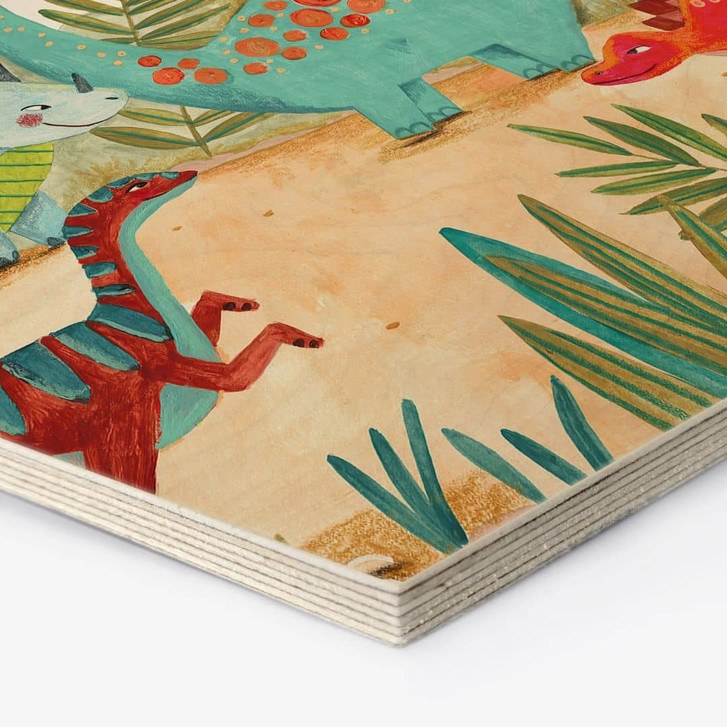 Die harmonischen Farben – von sanften Türkis- und Grüntönen bis hin zu leuchtendem Rot und Orange – machen dieses Bild zu einem fröhlichen Hingucker. Jeder Dinosaurier ist mit einzigartigen Details gestaltet, die die Fantasie anregen und zu neuen Geschichten inspirieren. Die natürliche Holzmaserung verleiht dem Bild Tiefe und einen warmen, natürlichen Charme.