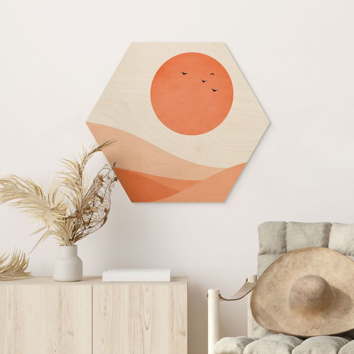 Hexagon-Holzbild Harmonische Landschaft orange - Kubistika