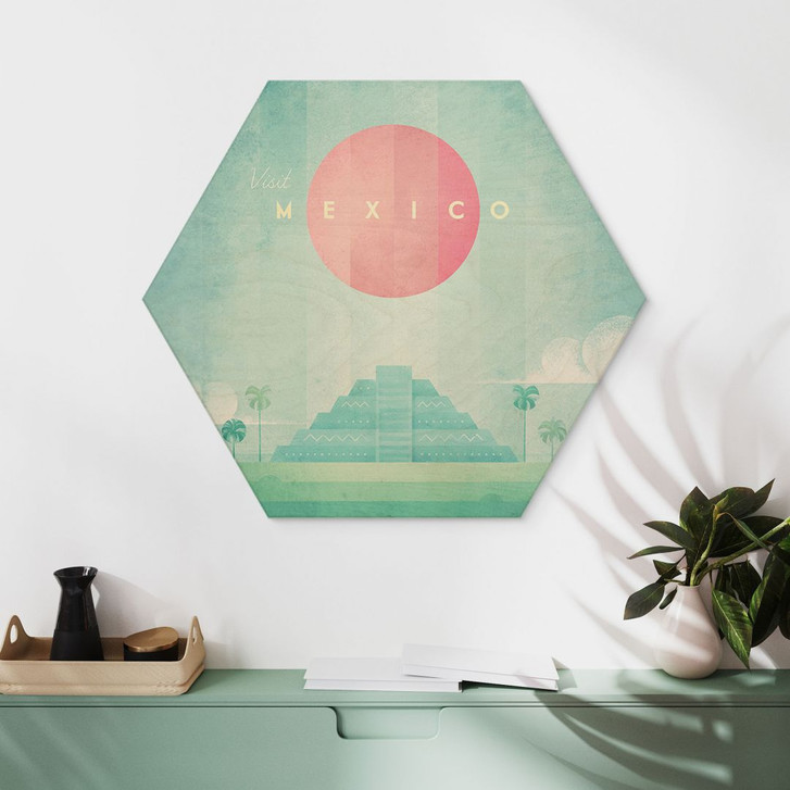 Entdecke die mystische Welt der Maya mit dem beeindruckenden Motiv „Tempel des Kukulcán in Chichén Itzá“ von Henry Rivers, das Geschichte und modernes Design verbindet. Der majestätische Tempel, umrahmt von einem zartrosa Heiligenschein und üppigem Grün, erweckt die uralte Magie von Chichén Itzá stilvoll zum Leben. Auf ein sechseckiges Holzbild gedruckt, verleihen die natürliche Holzstruktur und die geometrische Form diesem Kunstwerk einen warmen und doch dynamischen Look.