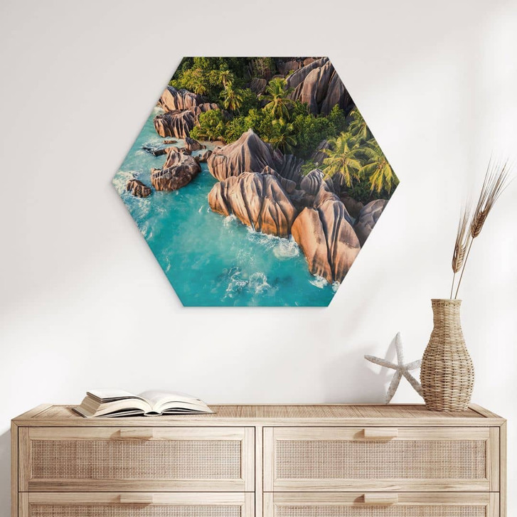 Hexagon Holzbild Tropische Felsenküste der Seychellen - Colombo