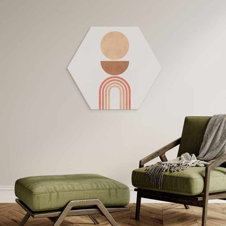 Vitor Costas Boho-Motiv auf einem sechseckigen Aluminium-Dibond vereint minimalistische Formen und warme Erdtöne zu einem modernen Kunstwerk, das Ihre Räume stilvoll aufwertet. Die geometrischen Elemente – ein runder Kreis, ein Halbkreis und geschwungene Bögen – fügen sich harmonisch in ein ästhetisches Gesamtkonzept ein, das für Ruhe und Ausgeglichenheit steht. Diese klare und zeitlose Formensprache passt hervorragend zu modernen und naturverbundenen Einrichtungsstilen.