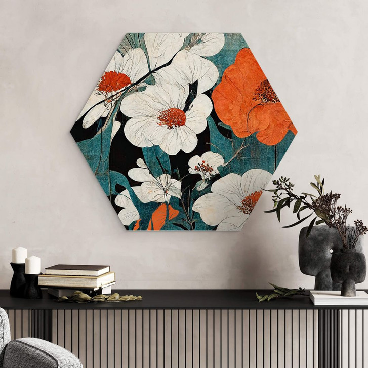 Hexagon Wandbild Asiatische Blütenpracht - Treechild - Alu-Dibond