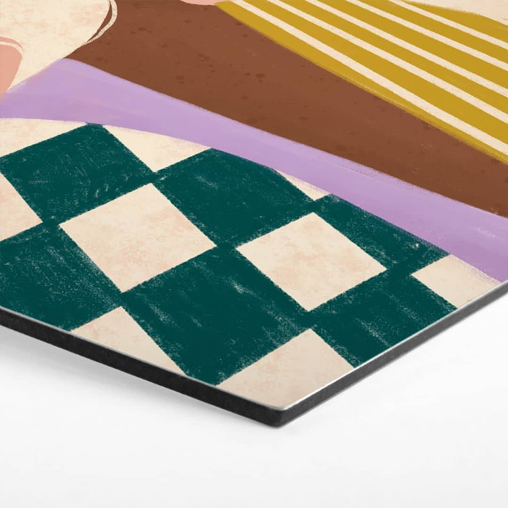 Ein aussergewöhnliches Kunstwerk, das durch seine harmonische Kombination von Farben, Formen und zeitgenössischer Eleganz beeindruckt. Bringe mit diesem einzigartigen Motiv einen Hauch moderner Kunst in deine Räume. Die Darstellung einer selbstbewussten Frau, umrahmt von geometrischen Mustern und sanften Farben, schafft eine fesselnde Balance zwischen Dynamik und Ruhe. Das karierte Smaragdgrün, das warme Senfgelb und das zarte Rosa des Hintergrunds bilden ein harmonisches Zusammenspiel, das die Stärke und Individualität der Figur hervorhebt. Die minimalistischen Details, wie rote Akzente und klare Linien, verleihen dem Motiv zusätzliche Tiefe und Charakter.