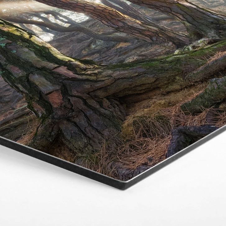 Ein Kunstwerk, das die Magie eines heiligen Waldes mit der Eleganz moderner Formen verbindet. Lass deine Wände Geschichten erzählen. Dieses atemberaubende Motiv entführt dich in einen Kiefernwald, der von zarten Sonnenstrahlen durchzogen wird. Die majestätischen Bäume mit ihren knorrigen Stämmen und ineinander verschlungenen Wurzeln wirken fast lebendig, während die goldenen Lichtstrahlen eine mystische und beruhigende Atmosphäre schaffen. Die harmonische Farbpalette aus üppigem Grün, erdigen Brauntönen und schimmerndem Licht macht dieses Bild zu einem unverwechselbaren Blickfang. Es ist eine Hommage an die unberührte Schönheit der Natur und eine Einladung, ihre stille Kraft in deinem Zuhause zu spüren.