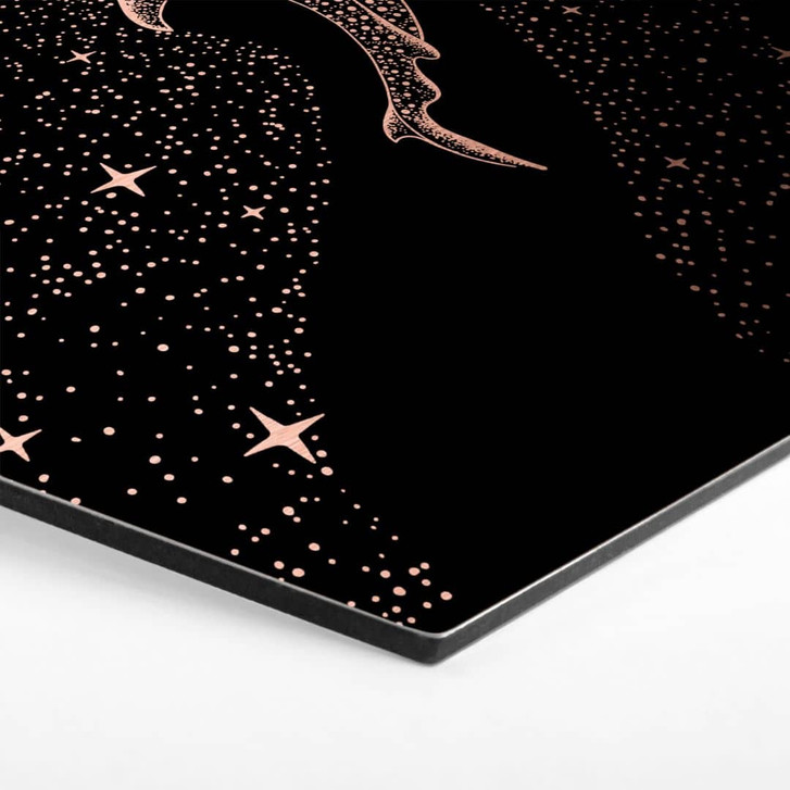 Dieses Kunstwerk ist auf hochwertigem, sechseckigem Aluminium-Dibond mit einer eleganten kupferfarbenen Oberfläche gedruckt. Die raffinierte Kombination aus tiefem Schwarz und schimmerndem Kupfer sorgt für einen luxuriösen und modernen Look. Die matte Oberfläche minimiert Reflexionen und lässt die funkelnden Sterne besonders intensiv erscheinen. Dank der langlebigen Materialqualität hält die brillante Darstellung viele Jahre lang an.