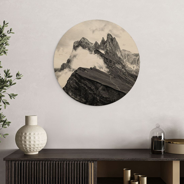 Erlebe die majestätische Schönheit der Dolomiten auf einem Rundholzbild, das die alpinen Felsformationen in einem sepiafarbenen Look präsentiert. Die markanten Gipfel, eingehüllt in sanfte Wolken, bilden eine atemberaubende Kulisse, die sowohl Kraft als auch Ruhe ausstrahlt. Die warmen Sepiatöne verleihen dem Motiv eine nostalgische Ästhetik und machen es zu einem zeitlosen Kunstwerk, das in jedem Raum eine besondere Atmosphäre schafft.
