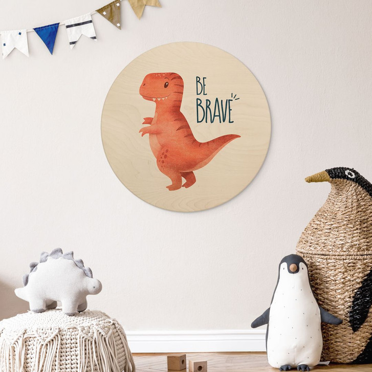 Spielen, lesen und schlafen – der Spielbereich ist der wichtigste Ort für jedes Kind. Hier können sich die Kleinen frei entfalten und wachsen. Und damit sie sich rund um die Uhr wohlfühlen, dürfen stilvolle Dekorationselemente nicht fehlen. Das runde Holzbild mit dem Motiv der Künstlerin Emel Tunaboylu zeigt einen kleinen T-Rex. Neben ihm steht der Schriftzug „Be Brave“. So wird der kleine rote Tyrannosaurus zum neuen Freund im Baby- oder Kinderzimmer.