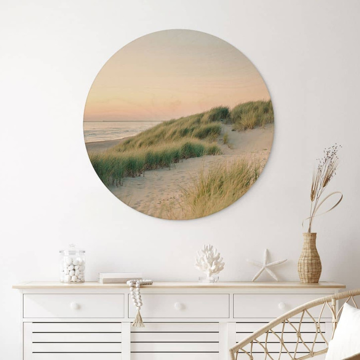Hol dir die Schönheit der Natur in dein Zuhause mit unserem runden Holzbild, das die friedliche Dünenlandschaft der niederländischen Küste in einem einzigartigen, natürlichen Format präsentiert. Das Motiv zeigt sanft geschwungene Dünen, die im warmen Licht eines Sonnenuntergangs erstrahlen, während das Meer im Hintergrund in beruhigenden Pastellfarben schimmert. Diese Szene strahlt Ruhe und Gelassenheit aus und bringt ein Stück unberührte Natur direkt in deinen Wohnraum.