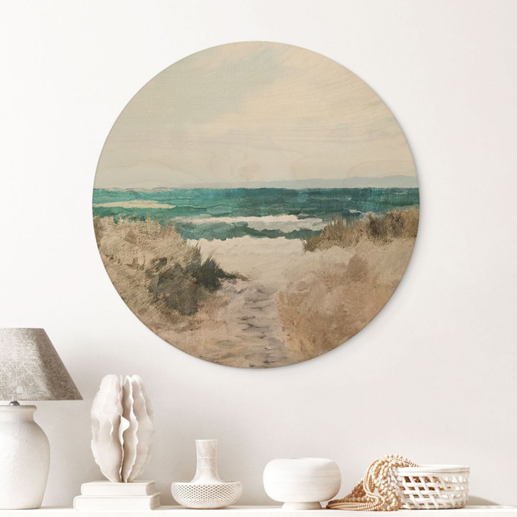 Dieses runde Holzbild bringt die friedliche Schönheit der Küstenlandschaft in deinen Wohnraum. Das stimmungsvolle Motiv zeigt einen Weg durch die Dünen, der direkt zu einem sanft plätschernden Meer führt. Die harmonischen Blau- und Grüntöne des Wassers und die erdigen Beigetöne der Dünen schaffen eine ruhige, entspannte Atmosphäre, die deine Räume mit natürlicher Schönheit erfüllt.