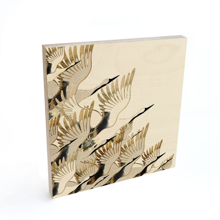Geradlinige Eleganz – Kraniche auf quadratischem Holzbild.