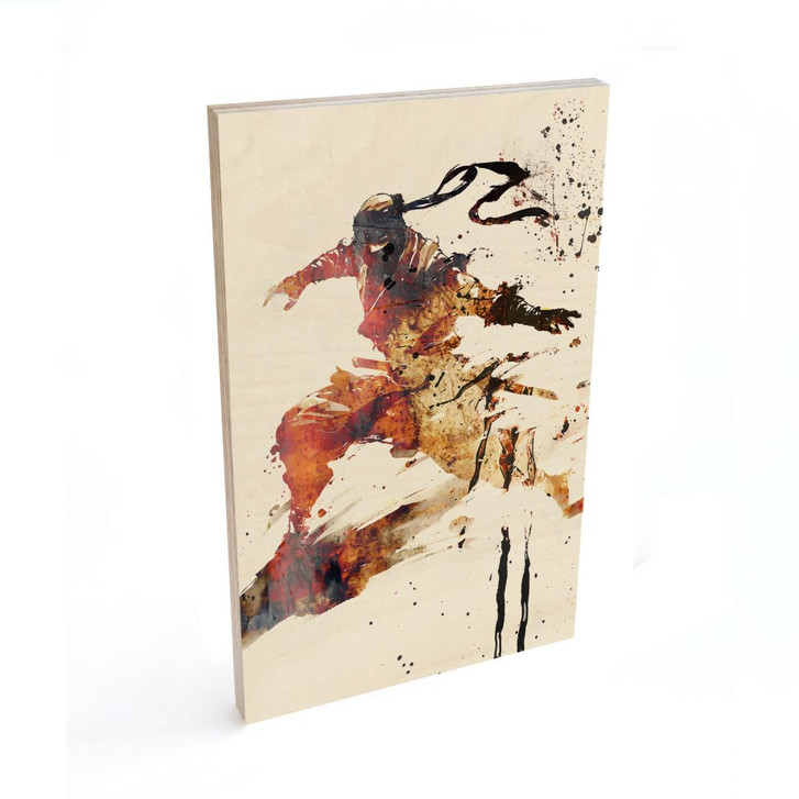 Dieses rechteckige Kunstwerk aus Holz fängt auf eindrucksvolle Weise die Essenz von Bewegung und Energie ein. Der dynamische Ninja in kräftigen Rot-, Orange- und Brauntönen wird durch abstrakte Farbspritzer und ausdrucksstarke Pinselstriche zum Leben erweckt. Die natürliche Holzmaserung verleiht dem Bild Tiefe und verbindet das kraftvolle Motiv mit der organischen Schönheit des Materials.