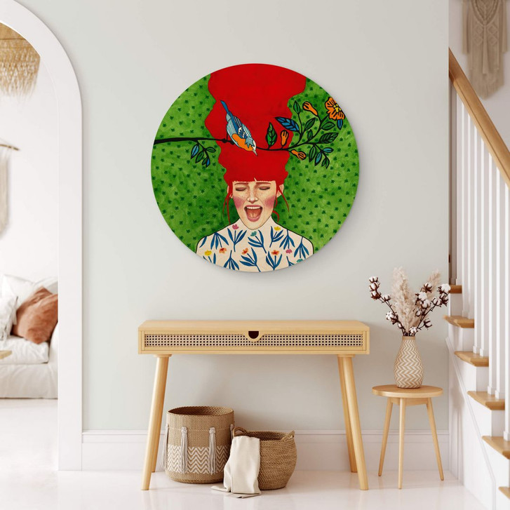 Nach den kalten Wintermonaten können wir es kaum erwarten, dass der Frühling erwacht. Die Sonne zeigt sich in ihrer ganzen Pracht, überall zwitschern Vögel und Blumen beginnen zu blühen. Wir sind so emotional, dass wir vor Freude laut lachen und schreien wollen – genau wie die Frau mit den leuchtend roten Haaren und der geblümten Bluse. Der farbenfrohe Kunstdruck in Form eines runden Holzbildes verleiht der Wand einen besonderen Look und passt perfekt zum Thema Frühling.