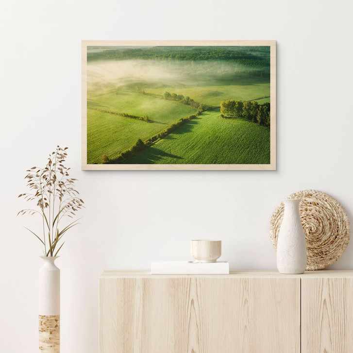 Erlebe die beruhigende Wirkung dieser idyllischen Feldlandschaft, eingehüllt in sanften Morgennebel. Die satten Grüntöne und weichen Konturen schaffen eine entspannende Atmosphäre und bringen ein Stück Natur in dein Zuhause.