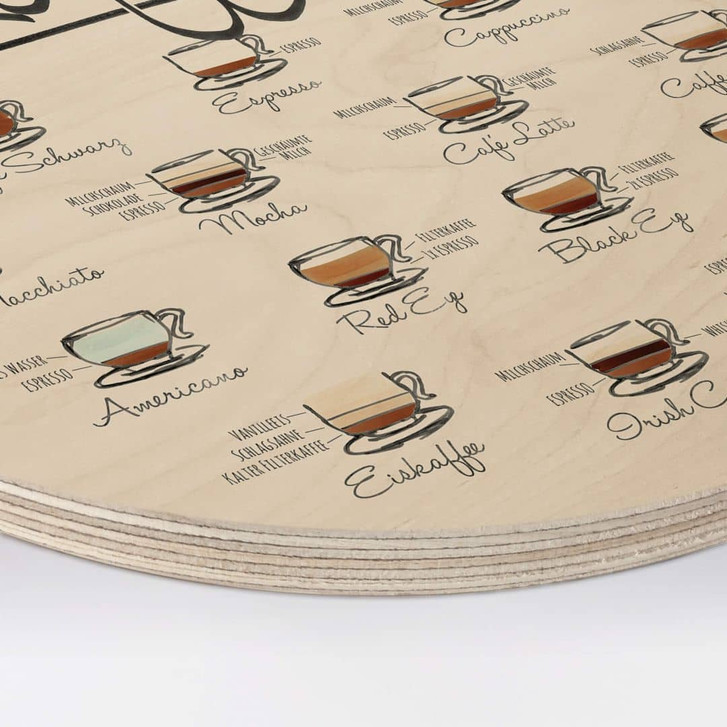 Kaffeeliebhaber aufgepasst: Welcher Kaffee darf es heute sein? Für Liebhaber von schwarzem Kaffee empfehlen wir Americano und Espresso. Wer seinen Kaffee lieber mit Milch trinkt, für den gibt es Cappuccino, Café Latte, Espresso Macchiato und Mokka. Ob als morgendlicher Muntermacher oder als Koffeinschub zwischendurch – das aromatische Getränk ist für viele von uns ein tägliches Ritual. Und mit diesem kreisförmigen Motiv kannst du in deiner Küche zu Hause, im Büro oder im Café eine einladende Atmosphäre für Kaffeetrinker schaffen. Die Darstellung verschiedener Kaffeesorten macht auf jeden Fall Appetit auf einen entspannten Kaffeemoment.