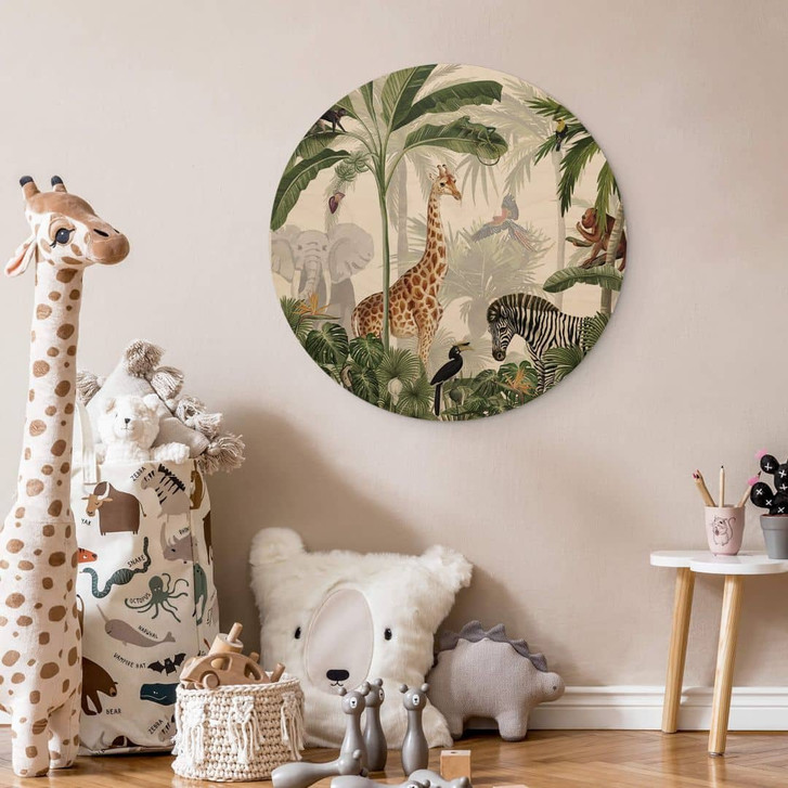 Das Kinderzimmer ist für unseren Nachwuchs oft ein Ort zum Schlafen, Spielen und Lernen zugleich, umso wichtiger ist es, es ansprechend einzurichten. Diese Dekoration ist genau das Richtige für solch vielfältige Anforderungen. Mit dem runden Wandbild mit der Illustration von Kikki Belle verwandelst du das Kinderzimmer in eine farbenfrohe Dschungelwelt. Lass dein Kind viele verschiedene wilde Tiere entdecken! Affe, Elefant, Tukan, Giraffe und Zebra – alles neue Freunde für kleine Entdecker!