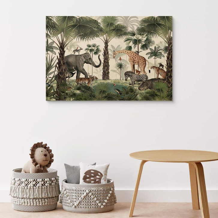 Ein Kinderzimmer ist oft ein Ort zum Schlafen, Spielen und Lernen zugleich, was es umso wichtiger macht, es harmonisch einzurichten. Diese Dekoration ist genau das Richtige für solch unterschiedliche Anforderungen. Das Kikki-Belle-Motiv eignet sich besonders für kleine Natur- und Tierliebhaber. Entdecke wilde tropische Landschaften! Diese Safari-Tour führt in ein Naturparadies, in dem Palmen, Tiere und Kulturen auf dich und die Kinder warten. Der vielfältige Tier- und Pflanzenlebensraum steckt voller Überraschungen, an jeder Ecke gibt es neue Lebewesen zu entdecken. Der ausdrucksstarke Kunstdruck zeigt die beliebtesten Tiere aus dem Zoo: Elefanten, Giraffen, Tiger und Freunde haben sich in der grünen Oase versammelt. Die atemberaubenden Palmen unterstreichen den exotischen Look und lassen Wände höher erscheinen. Nicht nur für Kinder: Das beeindruckende Tiermotiv bringt auch frischen Wind in Wohn- und Schlafzimmer.