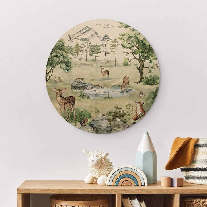 Für Kinder ist das eigene Zimmer ein Ort zum Spielen und Toben, aber auch ein Rückzugsort zum Ausruhen und Entspannen. Daher ist es besonders wichtig, diesen Raum individuell und abwechslungsreich zu gestalten. Das runde Holzbild mit der Illustration von Kikki Belle verwandelt das Kinderzimmer in einen kleinen idyllischen Wald. Lass dein Kind die verschiedenen Wildtiere entdecken. Hirsch, Hase, Igel, Waschbär, Adler, Streifenhörnchen, Fischotter, Ente und Fuchs – für jeden Tierfreund ist etwas dabei.