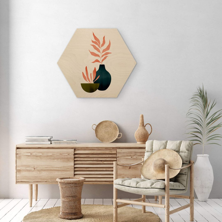 Wenn du dein Zuhause gemütlicher gestalten möchtest, ist dieses Pflanzenstillleben perfekt für dich. Die Illustration von Kubistika zeigt zwei Pflanzen in einer Pflanzenschale und in einer Vase. Die warmen Naturtöne sorgen für eine angenehme Note. Inspiriert vom skandinavischen Design, macht das Motiv im puristischen Stil „weniger ist mehr“ zu seinem Motto. Wir bieten das Pflanzenmotiv in verschiedenen Materialien und Grössen an. Es lässt sich gut mit modernen Illustrationen und Zeichnungen kombinieren.