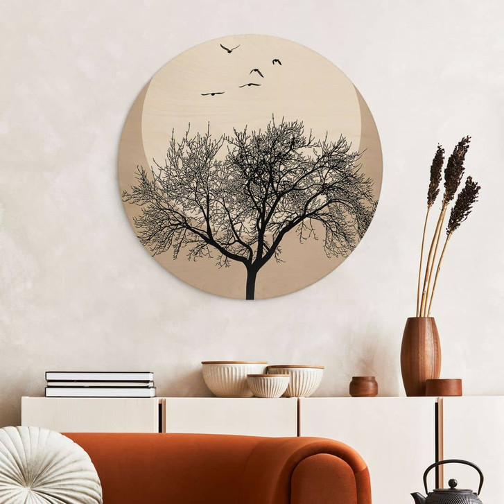 Hast du deinen eigenen, einzigartigen Stil? Mit unserem Wandaccessoire kannst du ihn gekonnt in Szene setzen. Verleihe deinem Wohnbereich eine einzigartige Atmosphäre. Dieser Kunstdruck schafft ein Gefühl von Weite. Das Motiv stammt aus der Serie Natur, Landschaften und Kunst und strahlt eine harmonische Stimmung aus, die zum Wohlfühlen einlädt. Sein rundes Format erweckt das Bild noch einmal zum Leben. Der Anblick des romantischen Abendhimmels ruft ein Gefühl von Freiheit und Glückseligkeit hervor. Die friedlichen Vögel und der beruhigende Baum vervollständigen das Bild einer Idylle. Der weite Blick lässt das Naturmotiv im Raum grösser erscheinen. Es schafft auch eine wunderbar harmonische Atmosphäre, die zum Träumen einlädt. Als Naturprodukt bringt das Holzbild ein besonders angenehmes Raumklima zu dir. Durch seine natürliche Maserung ist jedes Stück ein Unikat, während seine beigefarbene Färbung ihm einen stilvollen und modernen Look verleiht.