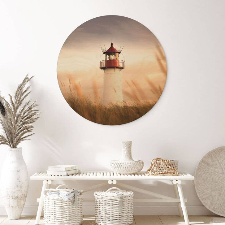 Die Kombination aus warmen Farben und dem leuchtenden Rot des Leuchtturms schafft eine harmonische und einladende Atmosphäre. Die runde Form des Holzbildes verleiht dem Design eine besondere Dynamik, die sowohl in modernen als auch in klassischen Einrichtungsstilen perfekt zur Geltung kommt.
