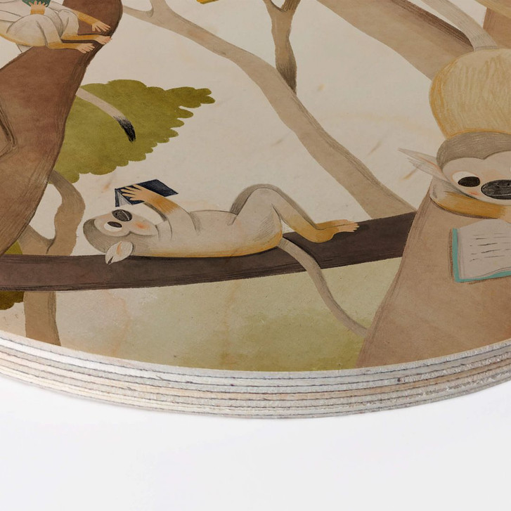 Vom Babyzimmer bis zum Jugendzimmer – für Kinder ist das eigene Zimmer ein Ort zum Spielen, Toben, aber auch ein Ort zum Zurückziehen und Ausruhen. Es ist daher ausdrücklich erwünscht, diesen wichtigen Ort individuell und abwechslungsreich zu gestalten. Die Illustration & Zeichnung der Künstlerin Judith Loske beinhaltet die Themen Insekten & Tiere und passt perfekt in ein Kinderzimmer. Das runde Holzbild eignet sich besonders für Leseratten. Vier kleine Äffchen haben es sich lesend hoch oben in den Bäumen gemütlich gemacht.