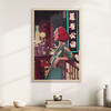 Dieser faszinierende Holzschnitt entführt in die nächtliche Atmosphäre einer pulsierenden japanischen Metropole. Eine junge Frau mit einem stylischen roten Bob lehnt entspannt an einem Balkongeländer, während sich die neonbeleuchtete Stadtlandschaft in der Dunkelheit entfaltet. Die Kombination aus sanften Pastelltönen und den lebendigen Lichtern Japans erzeugt eine harmonische Spannung, die sofort ins Auge fällt.