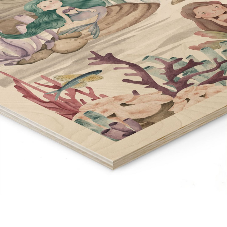 Dieses Holzbild von Oliver Robins verbindet die Wärme und Natürlichkeit von Holz mit der faszinierenden Schönheit einer magischen Unterwasserlandschaft. Das detaillierte Design der Meerjungfrauen, umgeben von einer Welt aus Korallen, Felsen und sanften Wellen, lädt zum Eintauchen in eine märchenhafte Welt ein. Die zarten Pastellfarben harmonieren perfekt mit der natürlichen Holzmaserung und verleihen dem Bild eine einzigartige Tiefe.