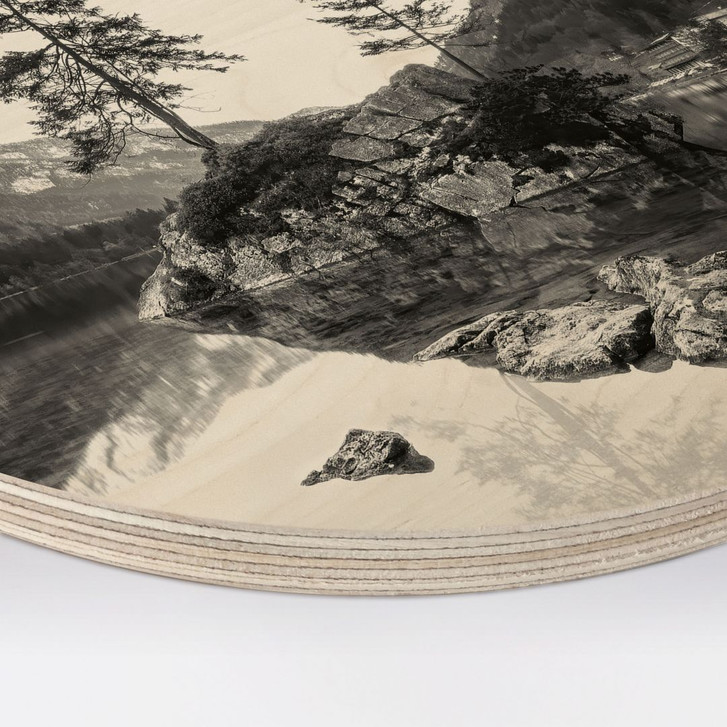 Dieses runde Holzbild fängt die zeitlose Schönheit einer alpinen Berglandschaft ein und verbindet sie mit der natürlichen Wärme von Holz. Der klare Bergsee im Vordergrund spiegelt die mächtigen Bäume und Felsen wider, die sich sanft aus dem ruhigen Wasser erheben. Die dahinterliegenden Berge, eingehüllt in Nebel, verstärken das Gefühl von Ruhe und Weite, das dieses Bild vermittelt. Die Holzmaserung fügt sich perfekt in das Bild ein und verleiht der Szene einen organischen, warmen Look.