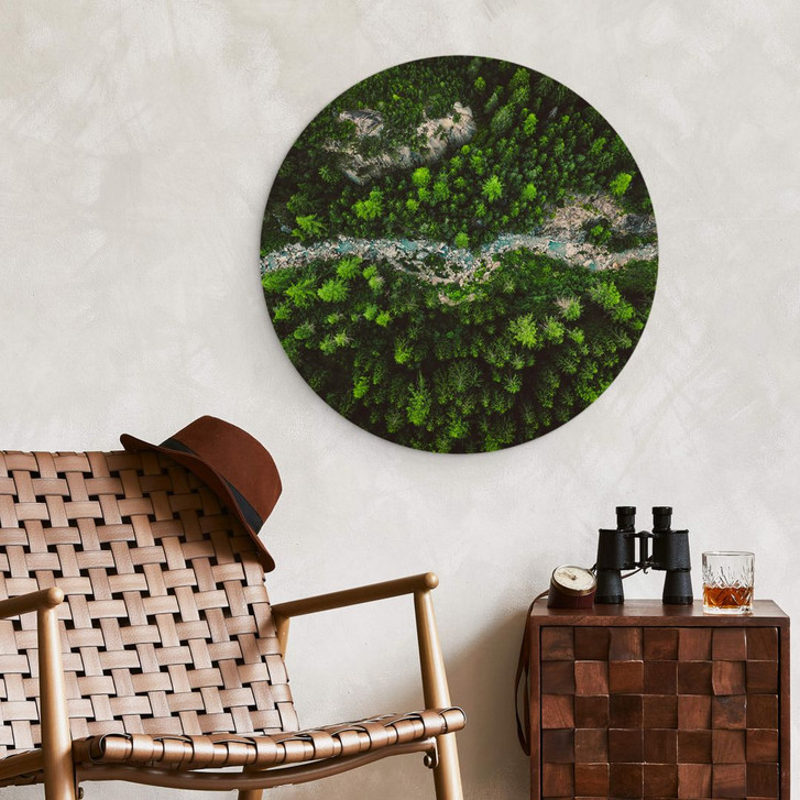 Dein Zuhause verdient eine aussergewöhnliche Dekoration, die deinem Geschmack entspricht und dich dazu einlädt, dich immer wieder wohl zu fühlen. Die Fotokunst von Dominik Murko entführt dich direkt in die unberührte Natur. Das runde Wandbild zeigt eine Luftaufnahme eines Waldes. Ein Flussbett schlängelt sich durch die grünen Bäume.