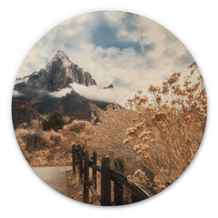 Mit diesem runden Holzbild holst du dir die beruhigende Wirkung der Natur in dein Zuhause. Das sanfte Zusammenspiel von nebelverhangenen Bergen, dichten Wäldern und pastellfarbenem Himmel verleiht jedem Raum eine meditative Atmosphäre. Die natürliche Holzstruktur schimmert durch das Bild und unterstreicht die organische Schönheit des Motivs.
