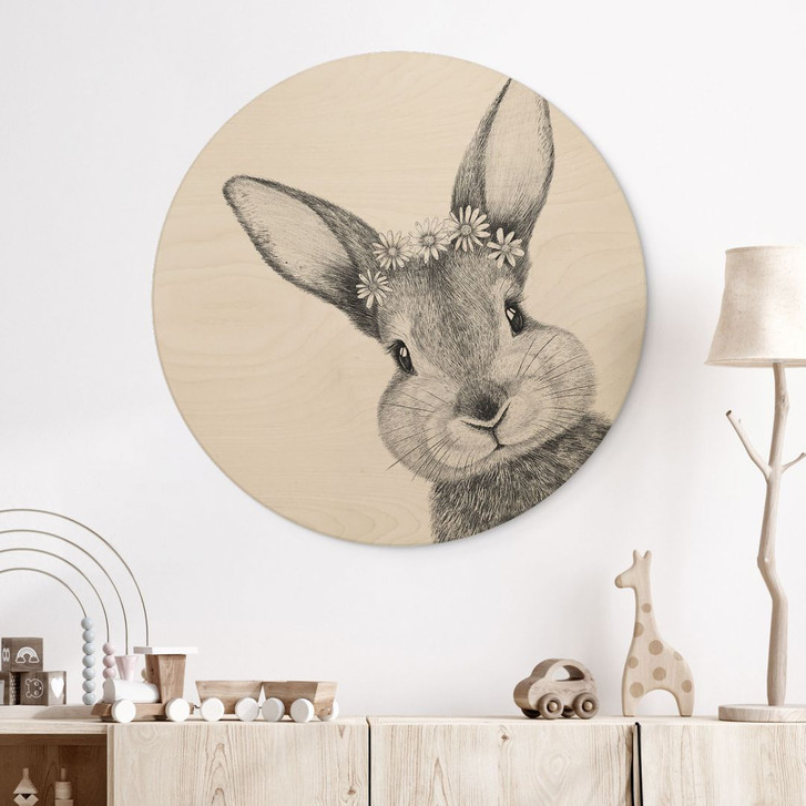 Dieses runde Holzbild von Valeriya Korenkova fängt die unvergleichliche Anmut eines Hasen ein, der mit einem bezaubernden Kranz aus Kamillenblüten geschmückt ist. Die detailreiche Schwarz-Weiss-Darstellung verleiht dem Motiv einen zeitlosen Charakter und hebt die zarten Linien der Illustration wunderschön hervor. Die natürliche Holzstruktur des Bildträgers ergänzt das Kunstwerk um eine authentische, warme Note und macht es zu einem echten Hingucker in jedem Raum.