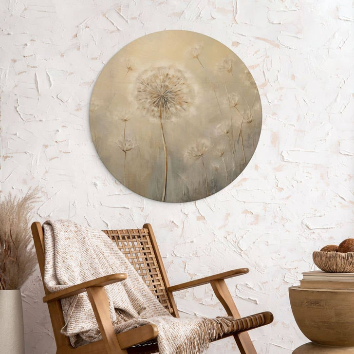 Dieses runde Holzbild bringt die zerbrechliche Schönheit des Löwenzahns harmonisch in deinen Wohnraum. Die zarten Blütenköpfe scheinen im sanften Wind zu tanzen, eingefangen in dezenten Creme- und Beigetönen, die eine beruhigende und angenehme Atmosphäre schaffen. Das natürliche Holz verleiht dem Kunstwerk zusätzliche Wärme und Tiefe, sodass es sich perfekt in eine Reihe von Einrichtungsstilen einfügt.