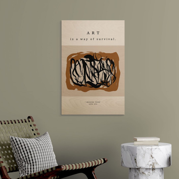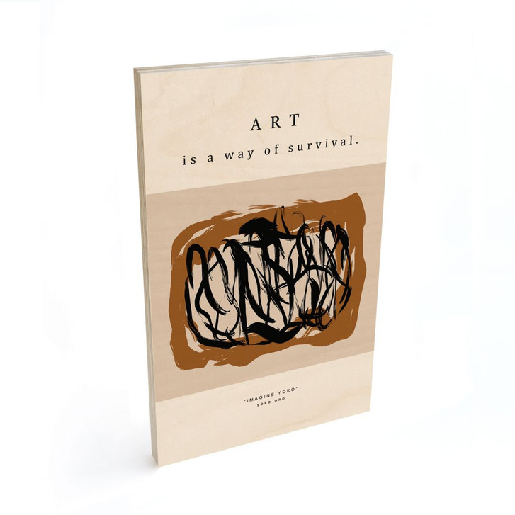 Dieses exklusive Holzbild von Treechild verbindet kraftvolle Kunst mit natürlicher Ästhetik. Die wilden, schwarzen Pinselstriche auf einem warmen Mokka-Hintergrund schaffen eine dynamische Komposition voller Energie und Ausdruck. Das Design wird durch das inspirierende Zitat „Art is a way of survival“ aus Yoko Onos Imagine Yoko ergänzt – ein künstlerisches Statement mit Tiefgang.
