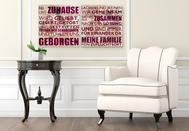Das Wandbild „Bei uns zu Hause ...“ geht weit über seine dekorative Wirkung hinaus. Der schöne Schriftzug beschreibt auf authentische Weise das Zusammenleben in der Familie – weg von der „Vorzeigefamilie“ hin zu einem turbulenten und unterhaltsamen Alltag, der immer wieder Neues bereithält.
