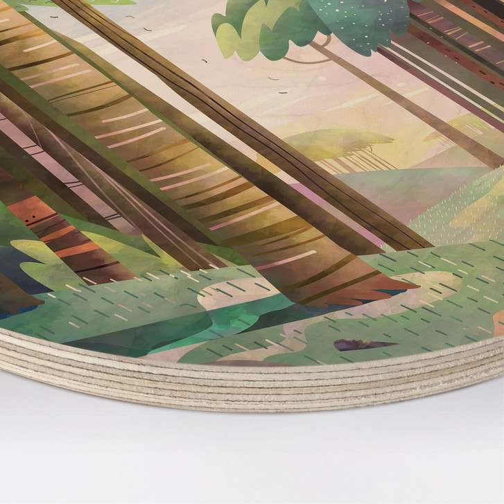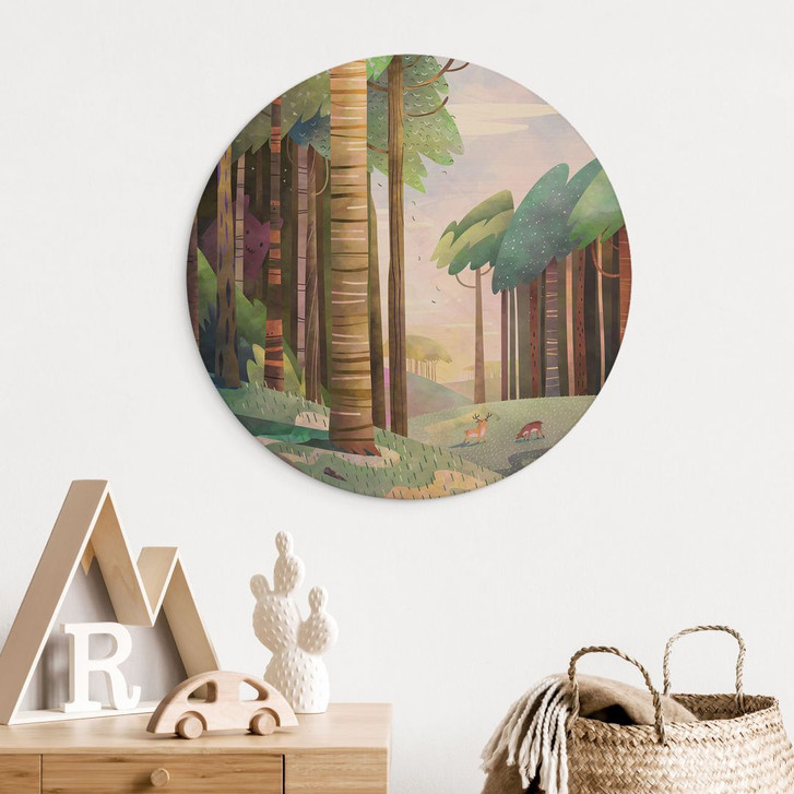 Holzbild Sonniger Wald mit Hirsch - DigitalArtsi - Rund
